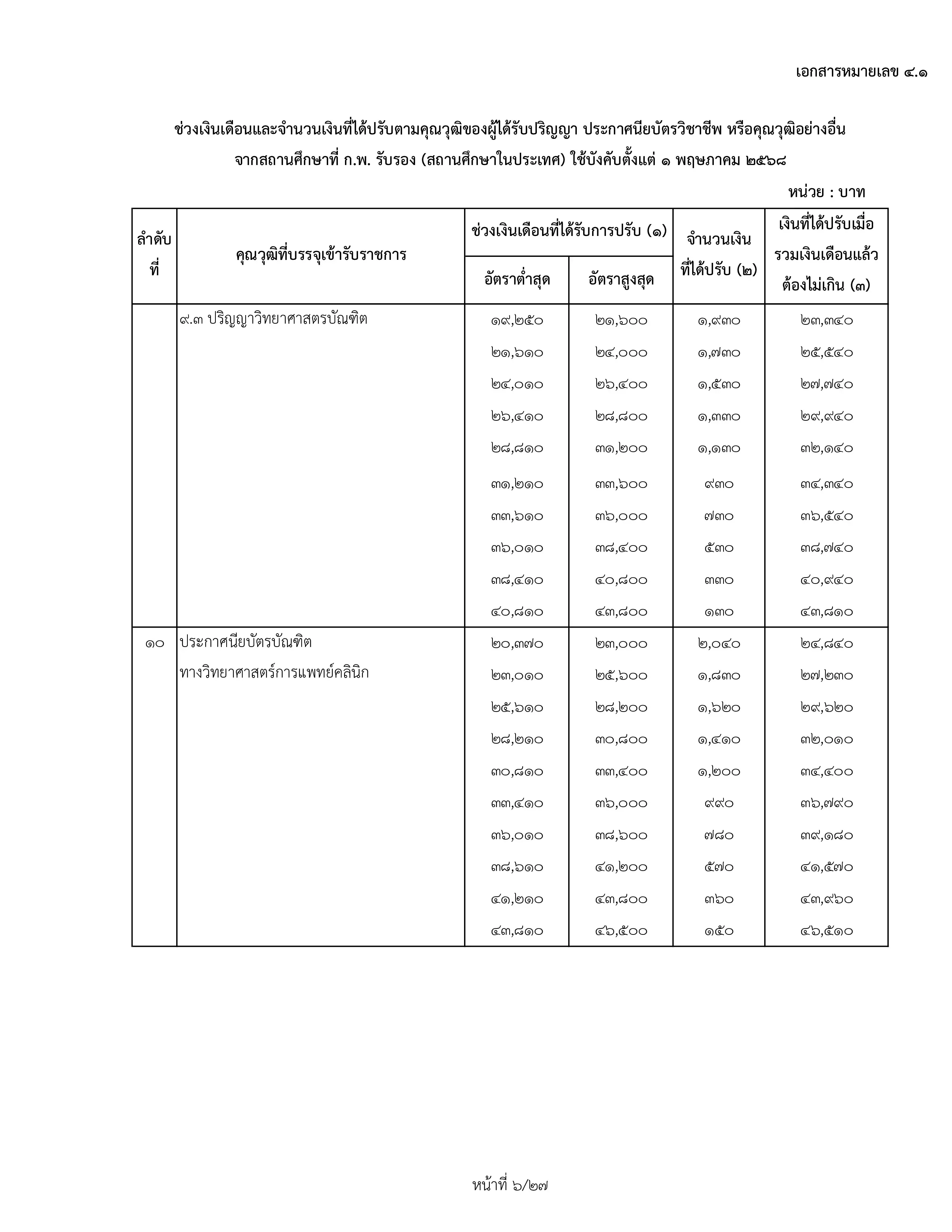 ข. ข้าราชการพลรือนที่บรรจุเข้ารับราชการ ตั้งแต่วันที่ 1 พฤษภาคม 2568 เป็นต้นไป ได้รับเงินเดือนเพิ่มขึ้นตามคุณวุฒิ ตั้งแต่วันที่ 1 พฤษภาคม 2568 โดยให้ได้รับตามช่อง ***ช่วงเงินเดือนที่ได้รับการปรับ (1)*** และไม่เกินอัตราที่กำหนดในช่อง ***จำนวนเงินที่ได้ปรับ (2)*** ทั้งนี้ เงินเดือนที่ปรับเพิ่มแล้วจะต้องไม่เกินอัตราที่กำหนดไว้ในช่อง ***เงินที่ได้ปรับเมื่อรวมเงินเดือนแล้วต้องไม่เกิน (3)***